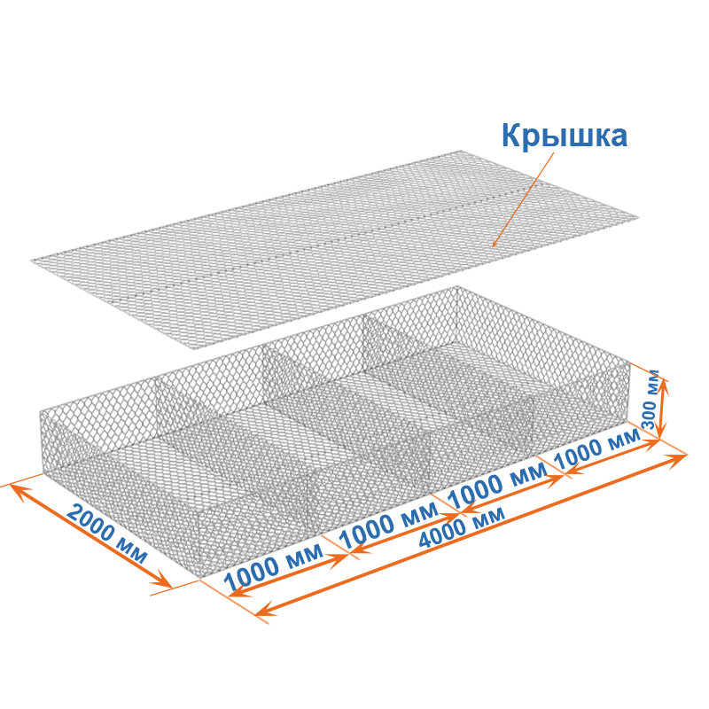 Матрасы Рено 4x2x0,3 — плоские габионные секции из сетки двойного кручения с ячейкой 60х80, проволокой 2,2 мм и покрытием Цинк.